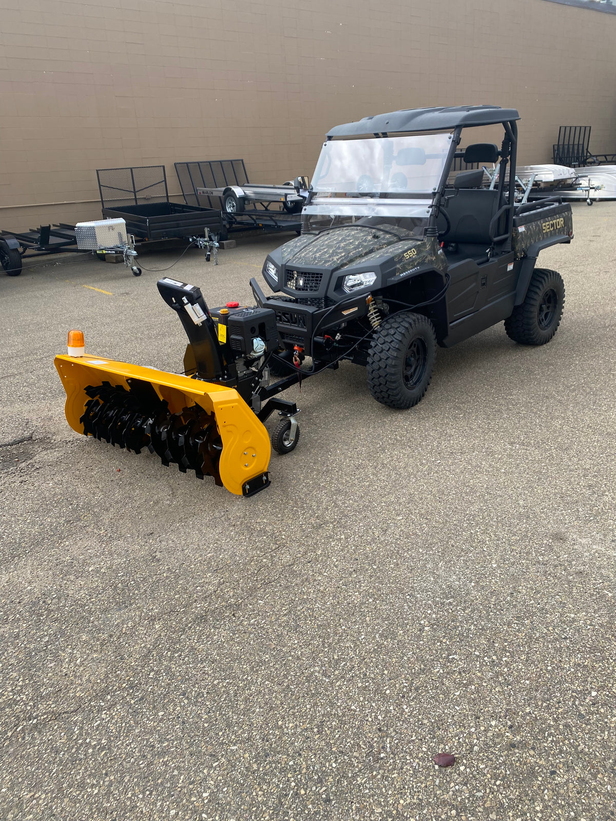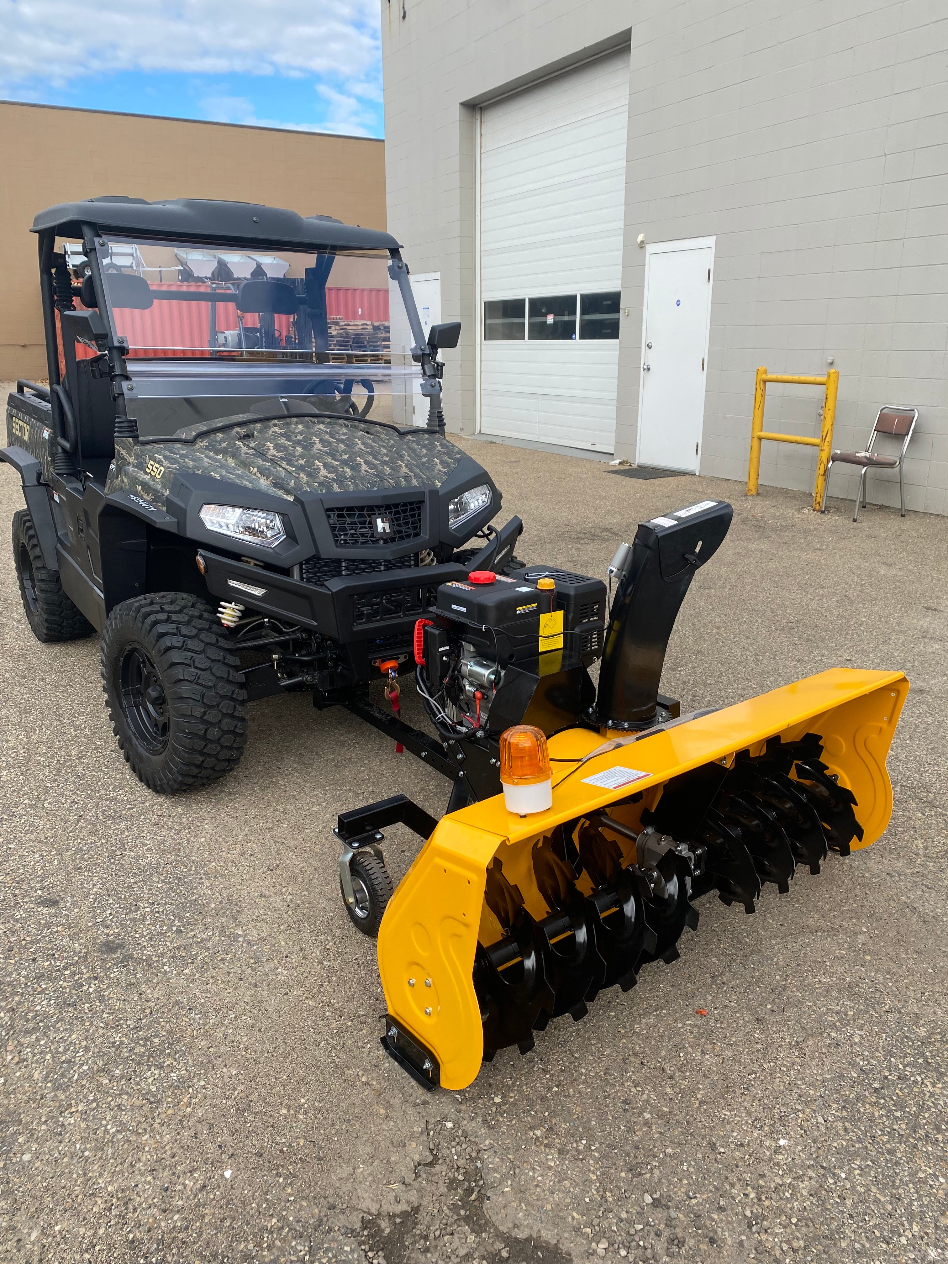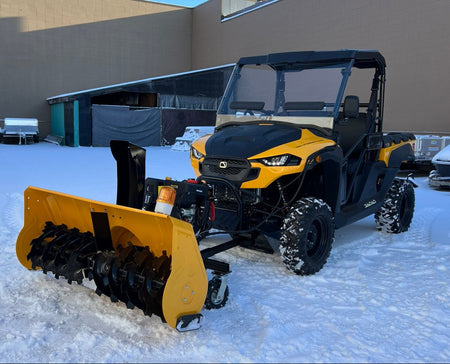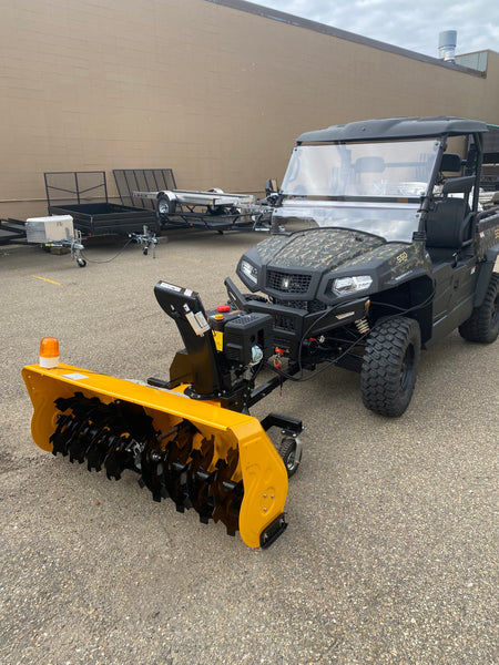 The B-WOLF SNOW BLOWER 420cc UTV/ATV Snow Blower has a thick steel body and steel auger allowing you to chew through deep snow and ice season after season. It is equipped with a convenient electric start and is easily controlled in the comfort of your UTV cabin.