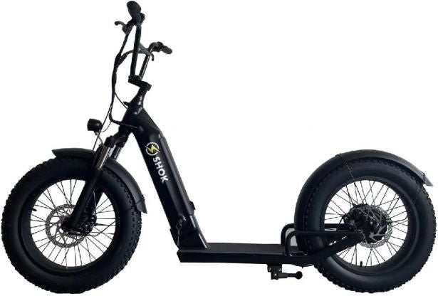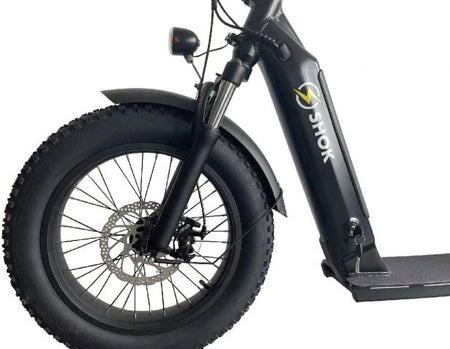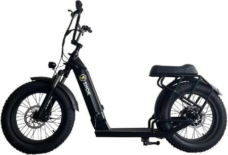 - Hybrid Design: The SHOK Fusion merges the sit-stand kick scooter style with the robustness of a 20-inch fat tire electric bike. It offers the agility and ease of access of a low-platform kick scooter while boasting the terrain-conquering capabilities of a fat tire e-bike.