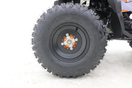 Oversized all-terrain tires on heavy-duty steel rims for aggressive grip and standout styling.